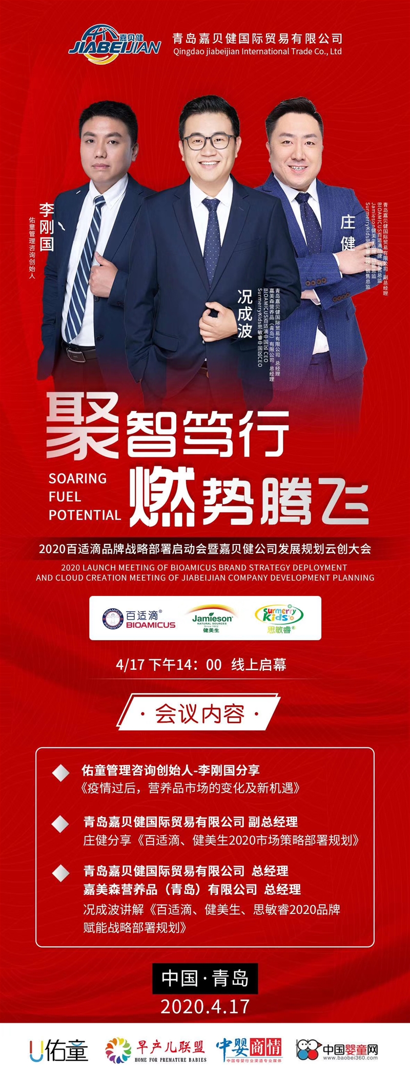 2020百適滴品牌戰(zhàn)略部署啟動(dòng)會(huì)暨嘉貝健公司發(fā)展規(guī)劃云創(chuàng)大會(huì)將于4月17日下午14:00在線盛大開啟。本次活動(dòng)由青島嘉貝健公司主辦,由佑童、早產(chǎn)兒聯(lián)盟、中嬰商情及中國嬰童網(wǎng)鼎力...