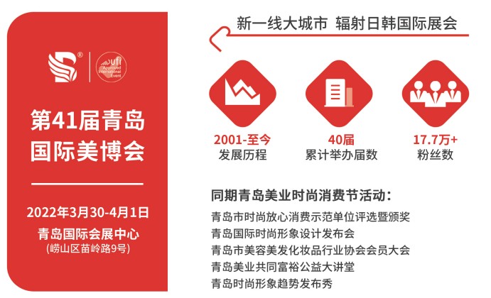2022第41屆青島國(guó)際美博會(huì) 時(shí)間:2022年3月30日-4月1日 地點(diǎn):青島國(guó)際會(huì)展中心(苗嶺路9號(hào)) 布展時(shí)間: 布展時(shí)間:3月28-29日 8:30-17:30...