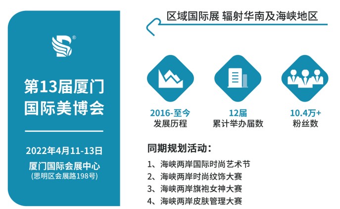 2022第13屆廈門國(guó)際美博會(huì) 時(shí)間:2022年4月11日-13日地點(diǎn):廈門國(guó)際會(huì)展中心(思明區(qū)會(huì)展路198號(hào)) 聯(lián)系人:趙麗15820035503 展覽日程安排 日期及開放時(shí)間...