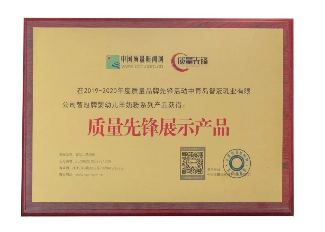 近日,智冠嬰幼兒羊奶粉入選“質(zhì)量先鋒”檔案。據(jù)了解,“質(zhì)量先鋒”檔案由中國質(zhì)量新聞網(wǎng)發(fā)起并在全國評選的,選擇在行業(yè)和品類中品質(zhì)優(yōu)...