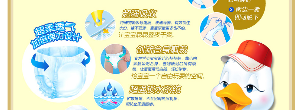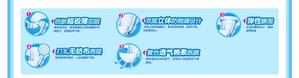 | 纖薄透爽系列功能介紹: ·創(chuàng)新超級薄芯層:高性能芯體,具有超強的5次尿液瞬間吸收能力,表面始 終干爽。 ·彈性魔術貼:新彈性魔術貼可隨寶寶運動自如伸縮始終貼服。 ·立體防漏隔邊:有效防測漏,媽媽更放心。 ·彈性腰圍:改進型腰圍設計,更舒適更貼身 ·打孔無紡布表層:能幫助更快吸收,小屁屁瞬間干爽。 ·復合透氣綿柔底膜:能快速派出悶熱濕氣,寶寶的小屁屁更加干爽舒適。 |