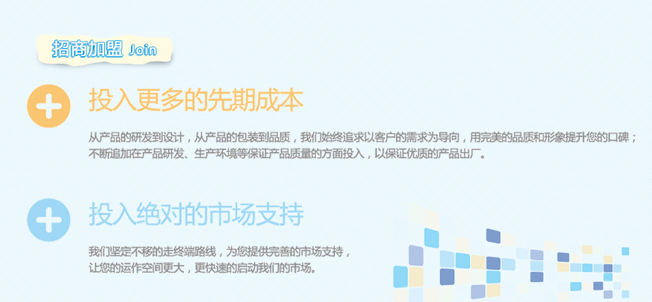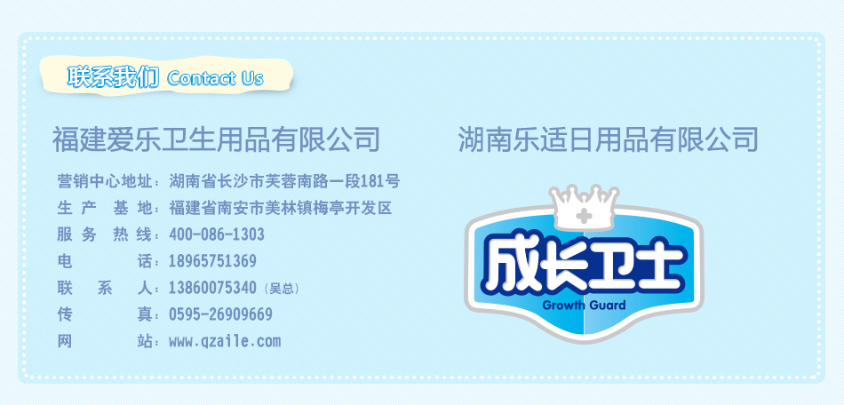 湖南樂(lè)適日用品有限公司于2012年成立,并于2013年初與愛(ài)樂(lè)衛(wèi)生用品有限公司結(jié)成戰(zhàn)略合作伙伴關(guān)系,共同致力于“成長(zhǎng)衛(wèi)士”品牌的打造。通過(guò)“為未來(lái)而來(lái)”的創(chuàng)新運(yùn)營(yíng)模式打造“成長(zhǎng)衛(wèi)士”親和友善、年輕活力、聰明睿智的品牌內(nèi)涵。憑借產(chǎn)品差異化及優(yōu)良的性價(jià)比,以獲未來(lái)長(zhǎng)遠(yuǎn)的發(fā)展。隨著不斷豐富的產(chǎn)品組合以及將會(huì)逐步擴(kuò)大的網(wǎng)絡(luò),“成長(zhǎng)衛(wèi)士”將為期待未來(lái)美好生活的消費(fèi)者提供更多選擇和生活享受。