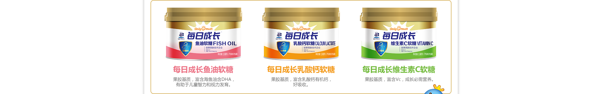 每日成長嬰兒食品品牌目前旗下已有產(chǎn)品包括七星茶、嬰兒米粉、葡萄糖、益生菌、清伙寶、糖果等系列產(chǎn)品,專為嬰幼兒健康成長提供支持和幫助。