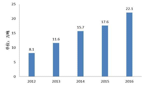 圖2 2012-2016年我國嬰幼兒配方乳粉進(jìn)口量