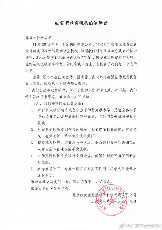 尊敬的社會各界: 11月28日晚間,北京朝陽警方公布了對北京市朝陽區(qū)紅黃藍(lán)新天地幼兒園事件的最新調(diào)查情況:該園教師劉某某因部分兒童不按時睡覺,遂采用縫衣針扎的方式進(jìn)行“管教”。因涉嫌虐待被看護(hù)人罪,現(xiàn)劉某某已被刑事拘留。針扎在孩子身上,也扎在了我們每一個人的心里。 此外,還有個別紅黃藍(lán)幼兒園也傳出家長舉報有疑似幼兒受到傷害的情況,園所已全力配合警方調(diào)查。 我們倍感難過和恥辱,向孩子們和大家深深道歉,對不起!我們沒有資格祈求原諒,唯有拿出實際行動。 為此,我們鄭重向全社會承諾: 1. 對任何人以任何方式傷害孩子的行為零容忍,懇請全體家長與社會各界,發(fā)現(xiàn)新的問題和線索,立即向公安機關(guān)舉報和反映。 2. 對在我們園所受到傷害的孩子,我們絕不推脫逃避,有錯必究,有責(zé)必?fù)?dān),承擔(dān)相應(yīng)法律責(zé)任。 3. 積極配合政府、家長與社會各界,全力保護(hù)孩子和教職工的人身安全與合法權(quán)益不受侵害。 4. 對幼兒園監(jiān)控系統(tǒng)進(jìn)行全面升級,確保做到無死角不間斷實時監(jiān)控。 5. 在專家指導(dǎo)下,與家長建立家園共育機制,盡最大可能開放透明辦學(xué)。 懇請全社會與我們一起共同守護(hù)孩子,守護(hù)未來。 感謝大家的關(guān)注與監(jiān)督。 北京紅黃藍(lán)兒童教育科技發(fā)展有限公司 二〇一七年十一月二十九日 ![]() |