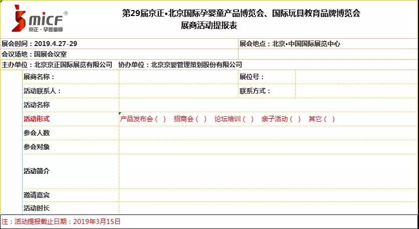 《活動(dòng)提報(bào)表》已上傳至京正國(guó)際官網(wǎng) 展商下載中心 https://www.jingzheng.com/?expo_down/id/1.html,如有需要,請(qǐng)自行下載。