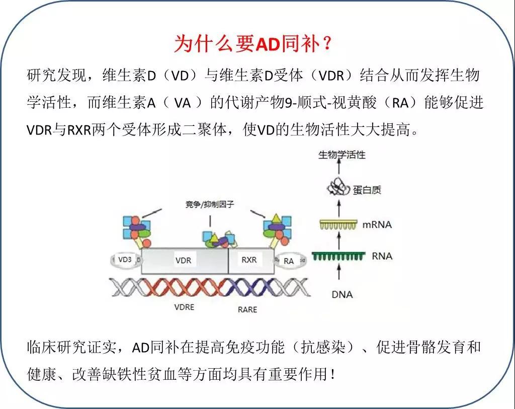推薦新生兒從出生后開始補充維生素AD,根據(jù)《中國居民膳食營養(yǎng)素參考攝入量》中的推薦攝入量(RNI),嬰幼兒維生素AD攝入的最佳配比為:維生素A vs 維生素D為3:1,能夠同時滿足維生素A和維生素D兩種營養(yǎng)素的科學合理的攝入量。目前市售的維生素AD滴劑(伊可新),0-1歲(綠色)規(guī)格含維生素A 1500IU,維生素D 500IU;1-3歲(粉色)規(guī)格含維生素A 2000IU,維生素D 700IU。每天一粒是安全的、有效的、合理的劑量,也是《中國國家處方集(兒童版)》推薦的預防劑量。