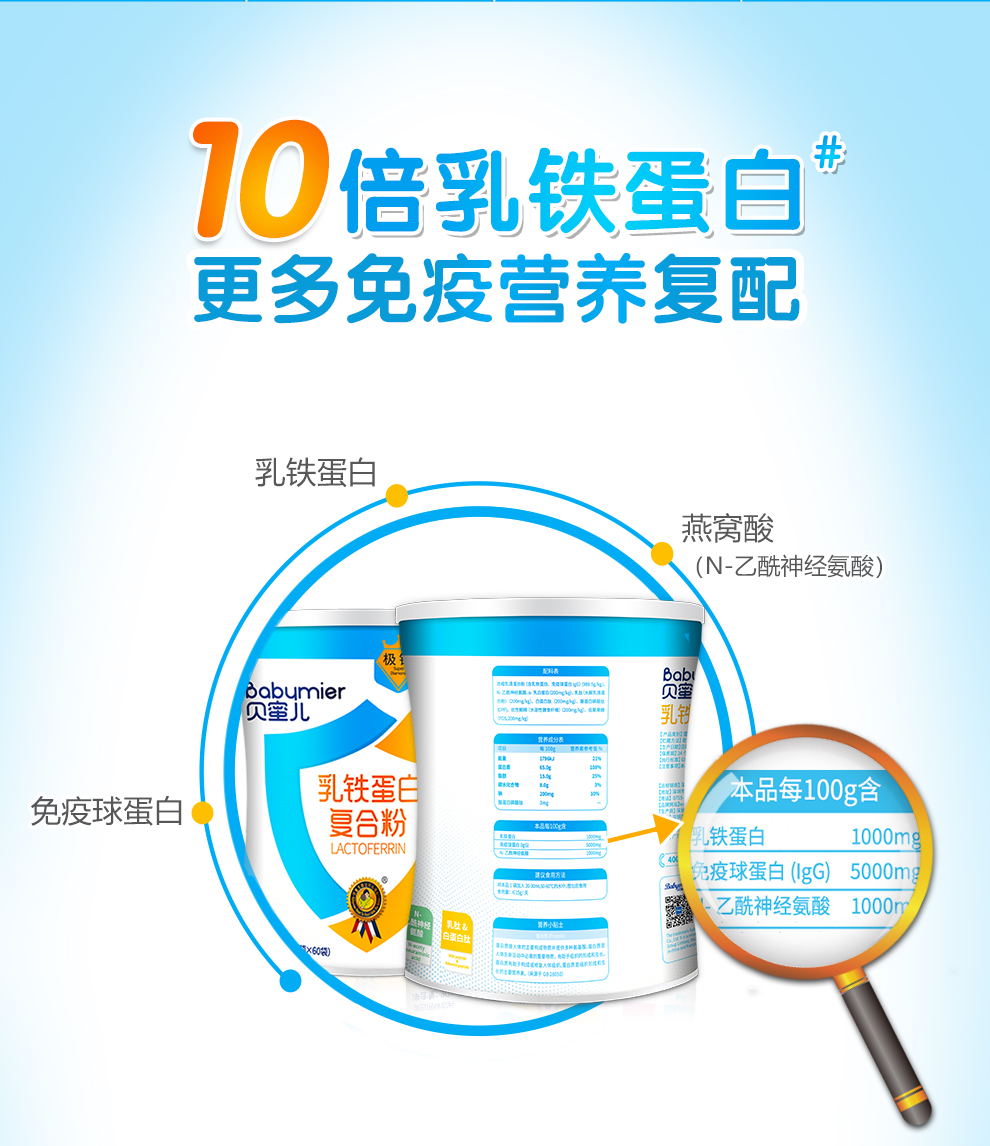 注:10倍乳鐵蛋白:貝蜜兒乳鐵蛋白復(fù)合粉(極鉆)同貝蜜兒其他規(guī)格乳鐵蛋白產(chǎn)品對比,1000mg/100g:100mg/100g=10:1