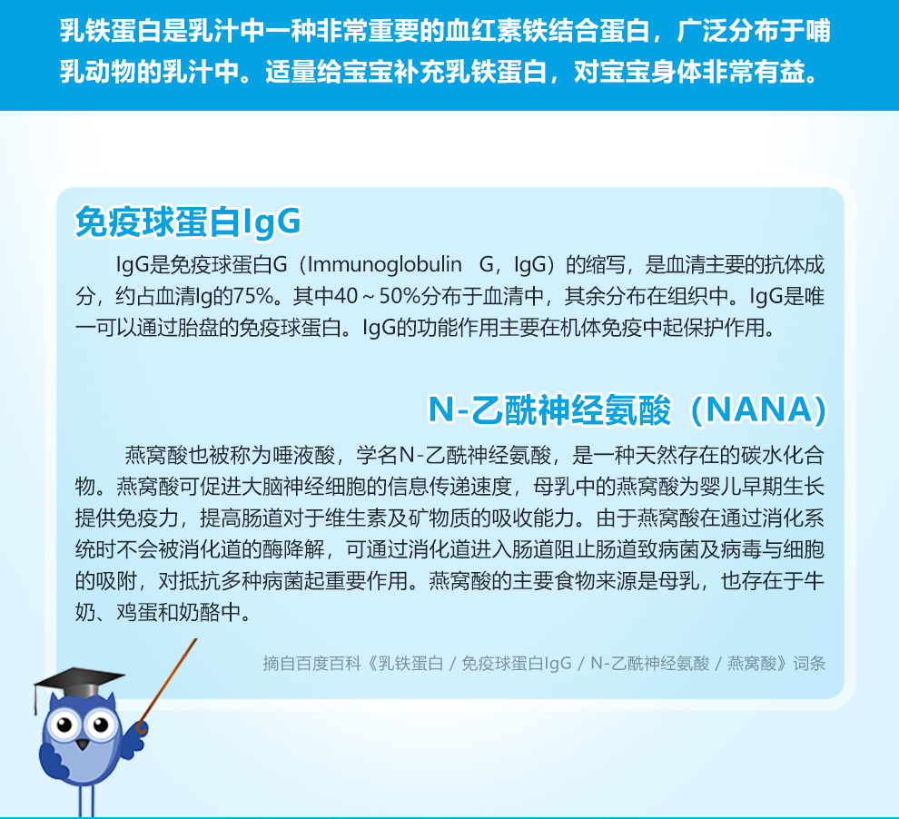②三重免疫營養(yǎng)(活性免疫物質(zhì)) 每袋免疫營養(yǎng)高達(dá)105mg,其中: l 乳鐵蛋白LF 1000mg/100g l 免疫球蛋白IgG 5000mg/100g l 燕窩酸(N-乙酰神經(jīng)氨酸) 1000mg/100g ![]()