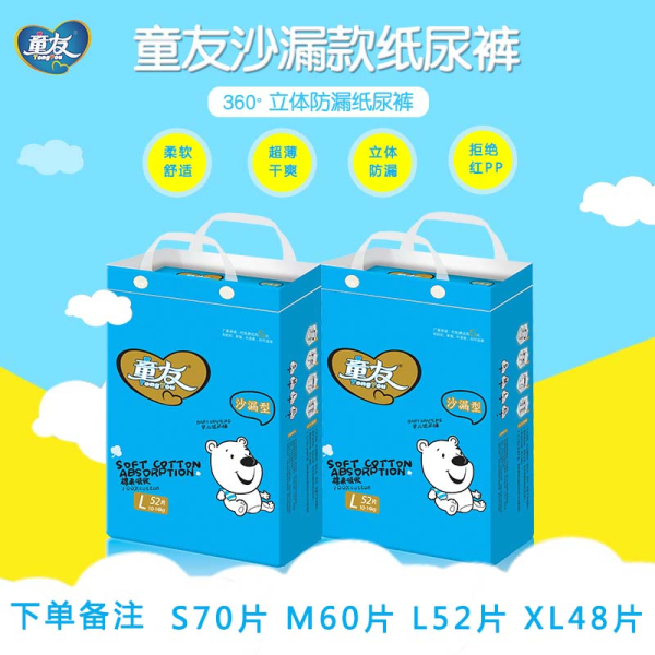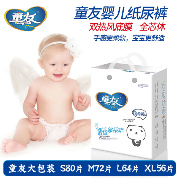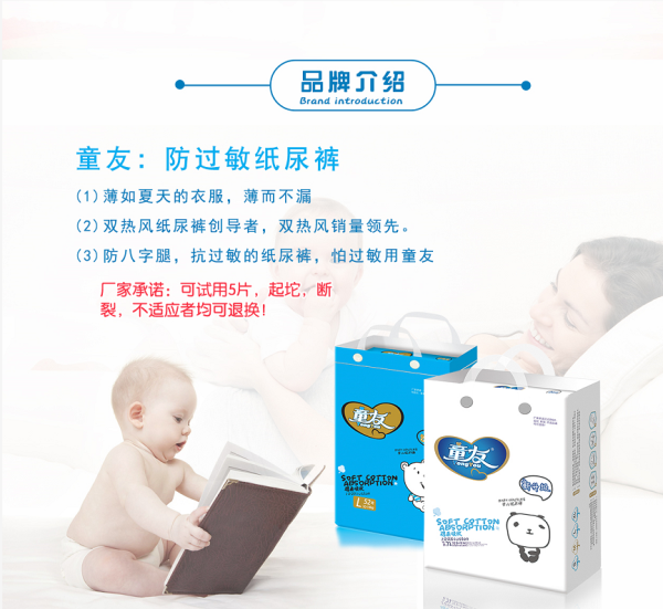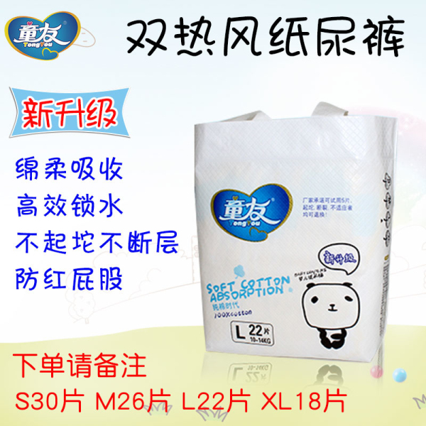 童友 紙尿褲是廣州愛茵母嬰用品有限公司生產(chǎn)的一款回頭率達95.73%的紙尿褲。敢在每包包裝袋右上方打上“可以免費試用五片包退包換”的售后服務,源于材料選用雙熱風材料(熱打孔面層、熱風底膜),并采用雙進口核心吸水因子,穩(wěn)定性達99%。