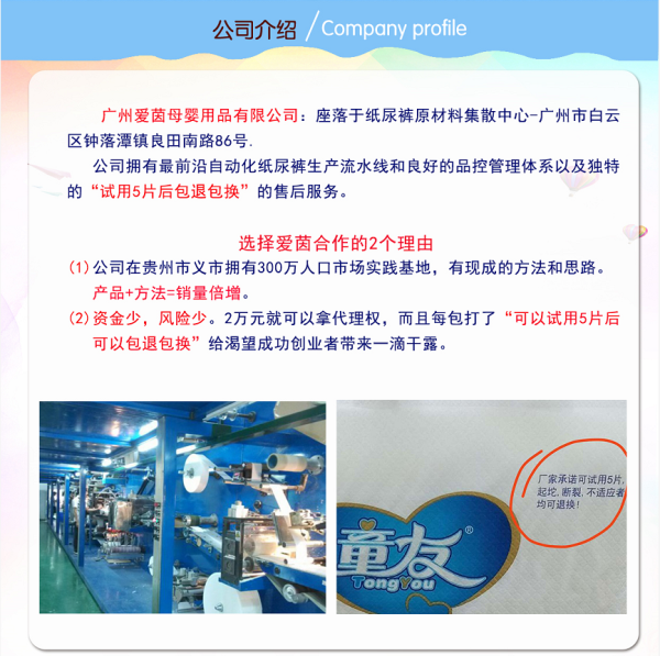 公司擁有自己的工廠生產(chǎn)線和專業(yè)研發(fā)團隊。童友 紙尿褲 理念是“用最少的錢,買最好品質(zhì)的紙尿褲”,選擇“童友”相伴一生,給你的事業(yè),人生帶來幸?鞓罚