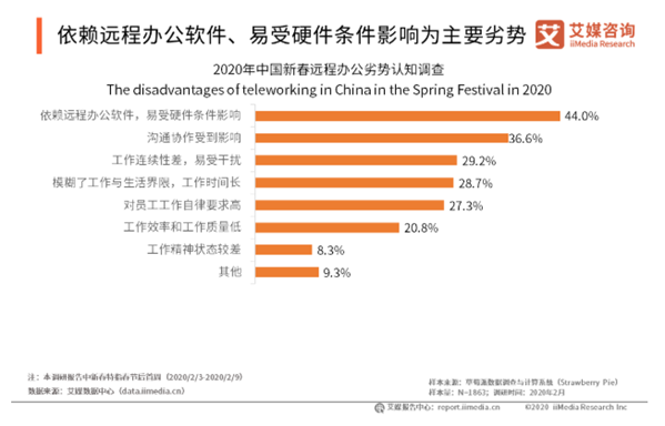 確實,借助互聯(lián)網(wǎng)進行線上辦公,受工作地點影響小,辦公安排較為靈活;而在家辦公還節(jié)省了通勤時間與交通費用,方便快捷。 然而有意思的是,在各類社交媒體中,關(guān)于遠程辦公的討論,更多是吐槽的聲音。在家容易被打擾、網(wǎng)速不穩(wěn)定、溝通不順暢等問題,匯聚成了一句:好想上班,回公司的那種! 調(diào)查結(jié)果也顯示,超四成的受訪用戶表示,遠程辦公存在依賴軟件,易受硬件條件影響的問題;近四成受訪用戶認為,遠程辦公溝通協(xié)作受到影響。不過,在多日的磨合下,已有超過五成的受訪用戶表示適應(yīng)遠程辦公模式。