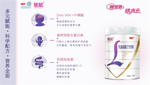 慧賦乳酸菌配方奶粉,是一款老少皆宜的百搭粉,作為宜品集團(tuán)首款研發(fā)的乳酸菌奶粉,我們采用比較稀缺的4連有益菌配方,有助于腸道的吸收。 宜品慧賦乳酸菌配方奶粉是宜品集團(tuán)首款獲得世界金獎(jiǎng)的乳酸菌奶粉,這意味著慧賦已經(jīng)獲得了世界各國包括食品發(fā)達(dá)國家的認(rèn)可與推崇。我們將繼續(xù)砥礪奮進(jìn),接下來,宜品慧賦會(huì)繼續(xù)貫徹集團(tuán)“宜人宜己 品質(zhì)中國”品牌理念,堅(jiān)持“慧營養(yǎng) 賦成長”產(chǎn)品品質(zhì)理念。未來,讓宜品慧賦與您一同見證輝煌! |