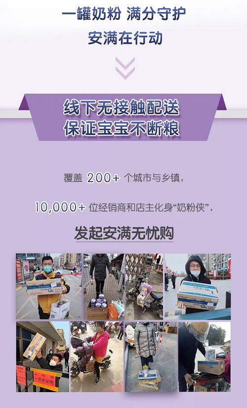 “無憂購”活動(dòng)有兩個(gè)目的: 1. 動(dòng)員門店通過無接觸送貨方式配送安滿產(chǎn)品,并且每送達(dá)一箱還會(huì)給予30元/箱的送貨補(bǔ)貼; 2. 針對消費(fèi)者恐慌性囤貨行為,推出買一箱再額外贈(zèng)送一罐的活動(dòng),降低消費(fèi)者囤貨的支出。 “一切為了客戶和消費(fèi)者!”匯澤團(tuán)隊(duì)不僅是這么說的,更是這么做的。 像匯澤這樣一心為客戶和消費(fèi)者著想的品牌運(yùn)營商自然也吸引了一群志同道合的合作伙伴。 在疫情期間,超過200+城市鄉(xiāng)鎮(zhèn)的10000+家安滿經(jīng)銷商和店主在交通受限的情況下,通過摩托車、自行車、甚至步行送貨到家的方式,為消費(fèi)者提供足不出戶的商品配送服務(wù),這些舉動(dòng)也讓他們贏得了“奶粉俠”這么一個(gè)特殊的稱號。