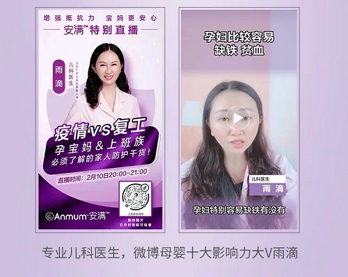 其次,權(quán)威專家坐診。為改善消費(fèi)者在特殊時(shí)期的焦慮和育兒知識(shí)的缺乏,恒天然快速響應(yīng)配合匯澤線下的應(yīng)急動(dòng)作,特邀國內(nèi)權(quán)威專家進(jìn)行直播,通過科學(xué)、專業(yè)的知識(shí)輸出來穩(wěn)定消費(fèi)者。 通過國家注冊營養(yǎng)師史繼紅、專業(yè)兒科醫(yī)生、微博母嬰十大影響力大V雨滴的專業(yè)講解,打造了安滿專屬的“戰(zhàn)疫”直播課堂,贏得了廣大消費(fèi)者的支持。