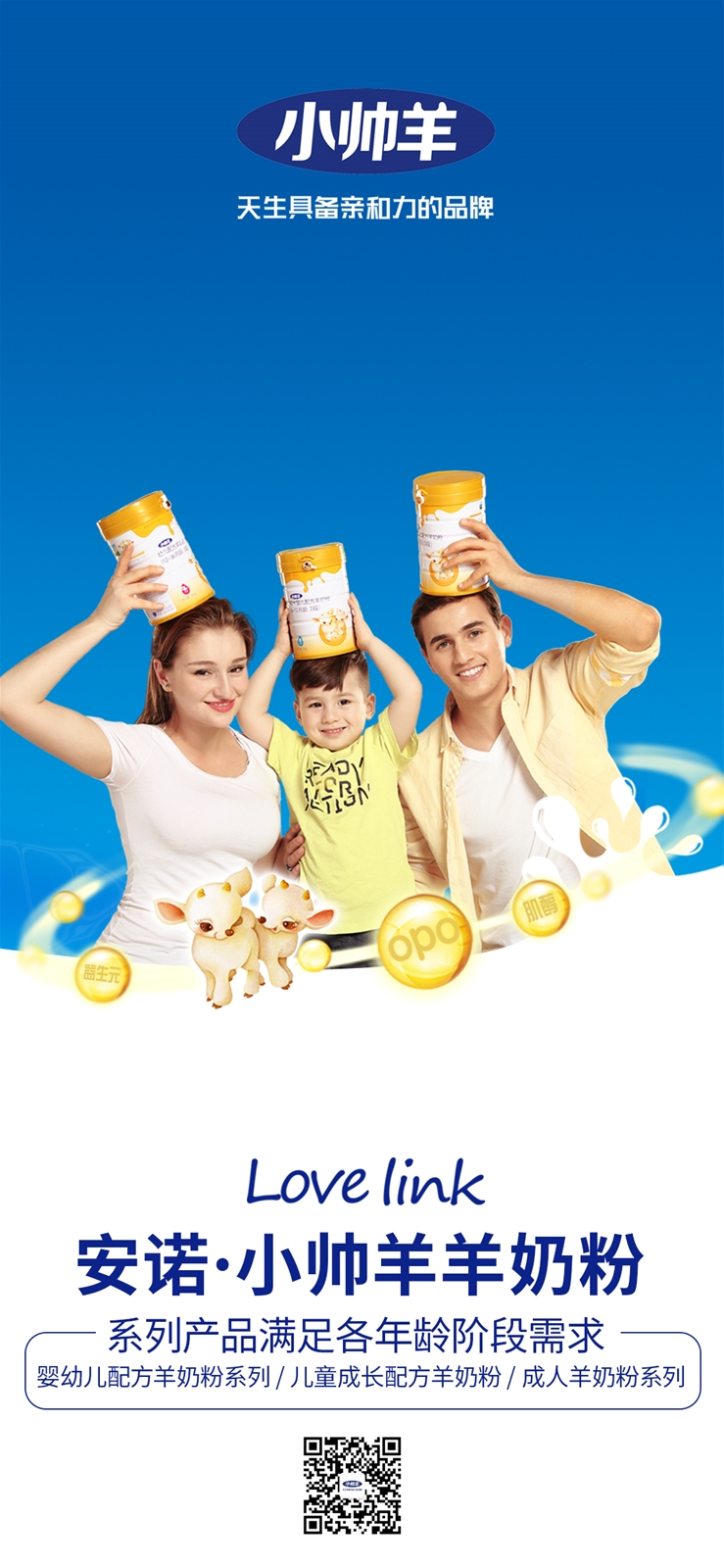 和寶寶們一樣,我們每個(gè)人都在成長(zhǎng),吸收每天的營(yíng)養(yǎng),消化未知的快樂(lè)。 社會(huì)把我們?nèi)嗄蟪商赜械臉幼,我們依然還給世界該有的微笑, 親和內(nèi)心的真實(shí),堅(jiān)定本質(zhì)的善良,才能造出真正優(yōu)質(zhì)的產(chǎn)品! 愛(ài)的營(yíng)養(yǎng),就像小帥羊系列羊奶粉一樣,緊密鏈接、不可或缺! 媽媽一口奶,親和一條鏈!我們很懂羊奶粉中營(yíng)養(yǎng)的微妙關(guān)聯(lián), 我們從小喝羊奶長(zhǎng)大,深知羊奶對(duì)體質(zhì)的太多好處, 我們把更好的羊奶產(chǎn)品——小帥羊,敬奉給我們的未來(lái)……