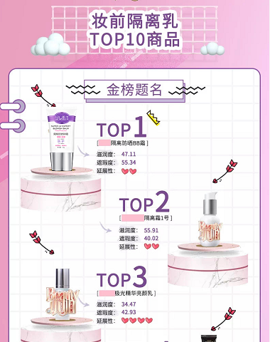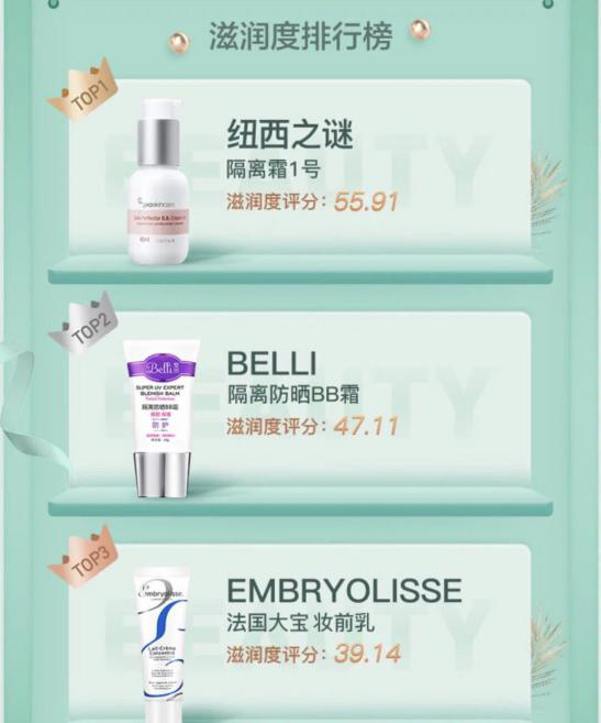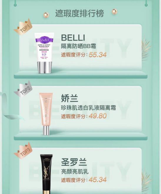 《beauty小姐》第二季正在火熱開播。作為國(guó)內(nèi)首檔以浴室為載體種草類美妝護(hù)膚綜藝欄目,以1:1還原嘉賓浴室為亮點(diǎn),搜羅嘉賓生活好物,分享生活方式、探討美妝觀念。每期還會(huì)針對(duì)一類美妝護(hù)膚產(chǎn)品進(jìn)行科學(xué)測(cè)評(píng)。為用戶提供科學(xué)便捷的種草路徑,有效傳達(dá)更健康的生活觀念與美妝理念。 本期由明星嘉賓與大家分享美妝、護(hù)膚保養(yǎng)心得,隔離一直是愛化妝女生的必選 " 裝備 ",為了讓各位仙女們?cè)诖杭緯r(shí)刻保持肌膚水潤(rùn)不脫妝,成為春季出行亮點(diǎn),本期《Beauty 小姐》就邀請(qǐng)眾嘉賓共同探討了關(guān)于妝前隔離的美妝護(hù)膚心得。 經(jīng)過之前全網(wǎng)用戶的票選,共有 100 款?yuàn)y前隔離參與第二輪的評(píng)測(cè)。該評(píng)測(cè)由中國(guó)檢驗(yàn)檢疫科學(xué)研究院進(jìn)行,綜合考慮多項(xiàng)指標(biāo),并重點(diǎn)對(duì)重金屬、化學(xué)防曬劑等 "9 X" 項(xiàng)有爭(zhēng)議的成分進(jìn)行嚴(yán)格審核,甄選出十款?yuàn)y前隔離組成了本次的 Beauty 公信榜。 一般來說,妝前隔離的功效大致有三種:隔離紫外線和空氣污染,隔離彩妝對(duì)皮膚的刺激以及調(diào)整膚色不均。而三億女生針對(duì)妝前隔離的消費(fèi)數(shù)據(jù)來看在選購(gòu)?qiáng)y前隔離時(shí) 43% 的人更關(guān)注均勻膚色的效果,20% 的人更關(guān)注滋潤(rùn)保濕效果,16% 的人更關(guān)注遮瑕效果。 經(jīng)過嚴(yán)苛的層層篩選,把100款隔離產(chǎn)品按照均勻膚色、滋潤(rùn)保濕、遮瑕三大細(xì)分維度進(jìn)行比較。終于誕生了本次公信榜裝妝前隔離乳的TOP1!——Belli隔離防曬bb霜!