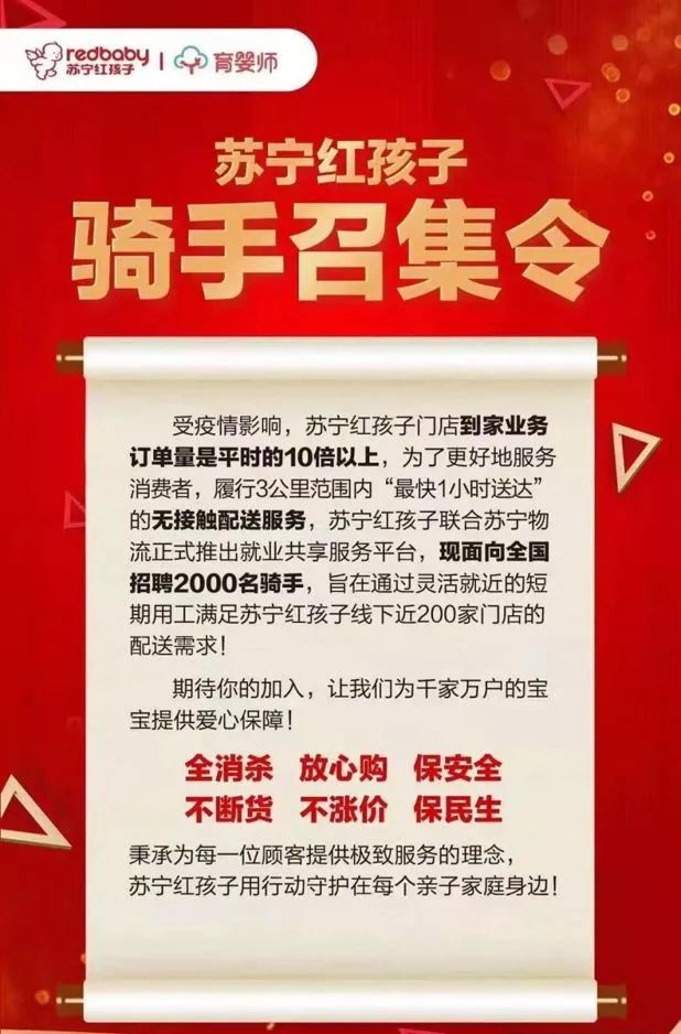 錢(qián)總說(shuō):“推客是一個(gè)多方共贏的0風(fēng)險(xiǎn)、0門(mén)檻商業(yè)模式,用戶(hù)以種草形式將商品分享到社交圈,也即將消費(fèi)場(chǎng)景下沉到私域流量圈,交易達(dá)成后即可賺取傭金”。 蘇寧紅孩子推客包括內(nèi)部員工和外部推客兩種,現(xiàn)如今,僅內(nèi)部推客人數(shù)就高達(dá)10萬(wàn),其中母嬰系統(tǒng)占比3成。而外部推客范圍更廣,包含早教、培訓(xùn)、月子中心等眾多合作機(jī)構(gòu)員工,以及用戶(hù)群體。當(dāng)談及推客帶來(lái)的銷(xiāo)售效應(yīng)時(shí),錢(qián)總總結(jié)說(shuō)道:“ 2月份員工使用推客推廣最高傭金額可達(dá)5.8萬(wàn),平均月收入4000左右,而外部推客現(xiàn)如今已有200萬(wàn)以上的用戶(hù)加入,產(chǎn)生的銷(xiāo)售量級(jí)更大”。 02 專(zhuān)業(yè)物流團(tuán)隊(duì)和43個(gè)中心倉(cāng) 確保社區(qū)半日達(dá)、同城次日達(dá)“無(wú)接觸配送” “無(wú)接觸配送”不是一句空話(huà),各環(huán)節(jié)密切配合才能體現(xiàn)好服務(wù) 依靠蘇寧強(qiáng)大的物流體系,蘇寧紅孩子線上電商擁有43個(gè)中心倉(cāng)來(lái)為消費(fèi)者服務(wù),近200家線下門(mén)店都在周邊區(qū)域、門(mén)店以及社區(qū)附近擁有獨(dú)立的倉(cāng)儲(chǔ),90%的訂單量實(shí)現(xiàn)了社區(qū)半日達(dá)、倉(cāng)庫(kù)次日達(dá)。 錢(qián)總說(shuō):“配送是接觸顧客的最后一關(guān),也是關(guān)鍵的一關(guān),只有各環(huán)節(jié)密切配合,顧客才能擁有好的服務(wù)體驗(yàn)”。 在“無(wú)接觸配送”方面,蘇寧紅孩子更加專(zhuān)業(yè)系統(tǒng)化。首先,在眾多社區(qū)設(shè)立的儲(chǔ)物柜及聯(lián)合其他物流公司共用儲(chǔ)物柜,這次發(fā)揮了獨(dú)有優(yōu)勢(shì),讓用戶(hù)更放心。其次,為了確保萬(wàn)無(wú)一失,蘇寧紅孩子在出貨時(shí)、送貨前、送達(dá)前等各個(gè)時(shí)間節(jié)點(diǎn),如何與消費(fèi)者溝通,確保商品送達(dá),都有一套標(biāo)準(zhǔn)的流程和話(huà)術(shù)支撐,并嫻熟運(yùn)用到技術(shù)端和配送端等。 首嘗“共享就業(yè)”模式,解決物流配送運(yùn)力不足難題 錢(qián)總說(shuō):“疫情期,因?yàn)榫上業(yè)務(wù)的激增,對(duì)我們?cè)械奈锪鬟\(yùn)力挑戰(zhàn)加大,員工全部上手送貨,再加上蘇寧物流的配送,還是人手不夠用,配送超過(guò)預(yù)期;诨ヂ(lián)網(wǎng)思維,我們快速的嘗試啟動(dòng)了‘共享就業(yè)’這種新模式,幫助我們加大配送、升級(jí)無(wú)接觸配送服務(wù)”。