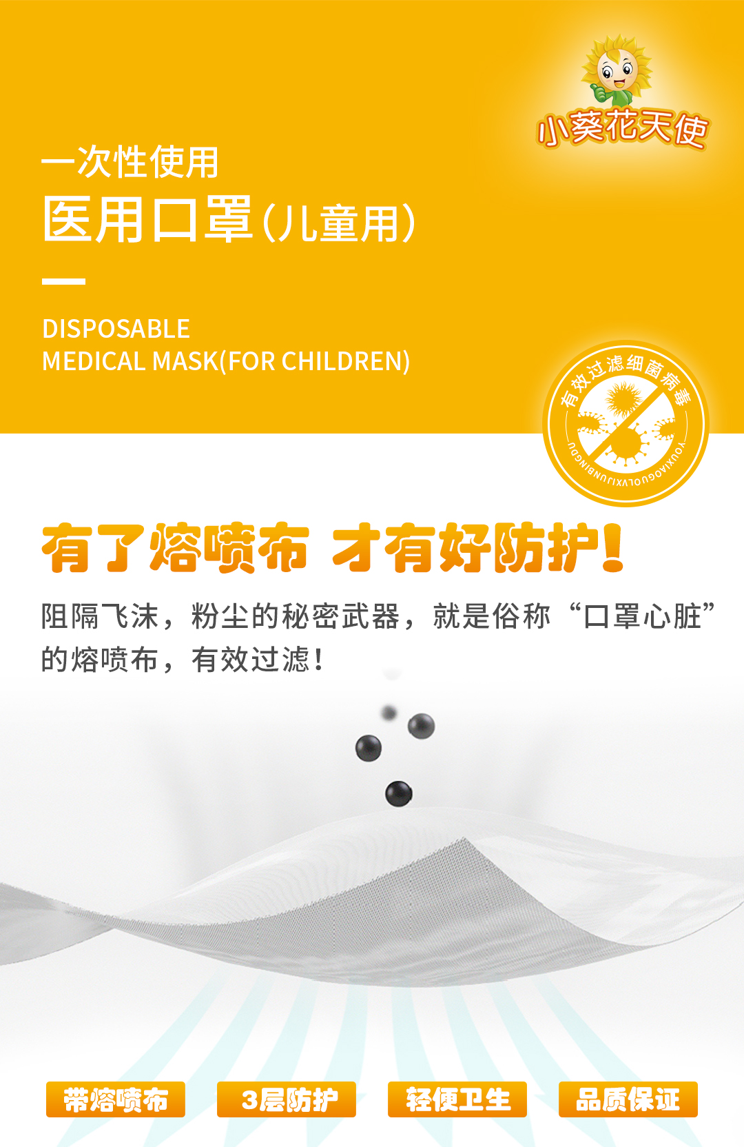 ![]() 作為“佰氏健康(廣州)大健康科技有限公司”旗下兩大主打品牌——“小葵花天使”、“葵花”專業(yè)從事一次性醫(yī)用口罩的研發(fā)及生產(chǎn),類別涵蓋了成人及兒童,采用三層防護(hù)設(shè)計(jì),多重過(guò)濾,質(zhì)檢測(cè)試BFE為99%!低呼吸阻力,高效過(guò)濾空氣,形成360°立體呼吸空間,防水透氣,不懼飛沫,可有效隔離有害顆粒,守護(hù)健康。后疫情時(shí)代,以過(guò)硬品質(zhì)守護(hù)全家健康!