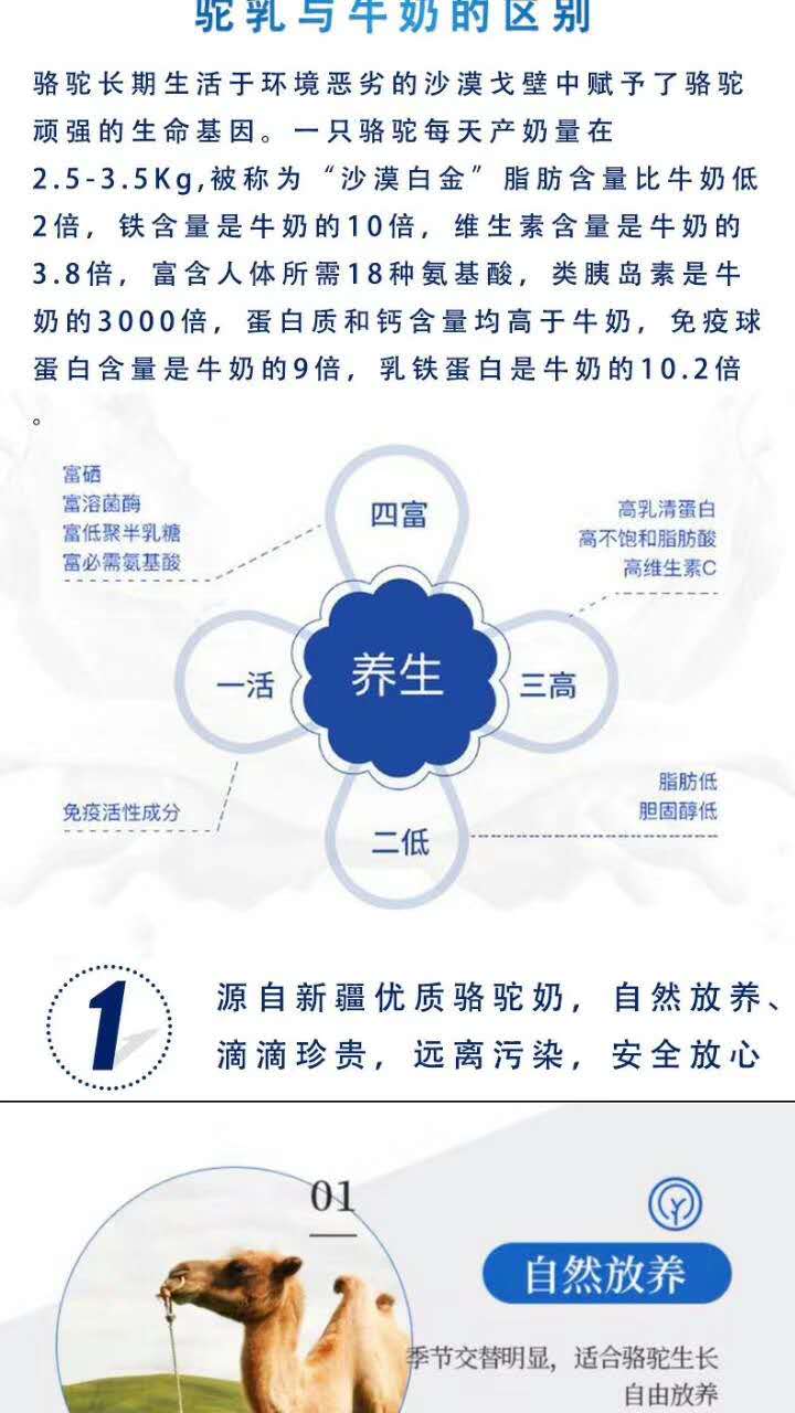 乳糖不耐受人群福音(駱駝不含過敏源,駝奶乳糖含量極低) ️糖尿病人一定要喝的奶(每毫升富含52個微單位的胰島素因子) ️有助于小朋友生長發(fā)育和智力發(fā)育(鈣含量是牛奶的10倍)