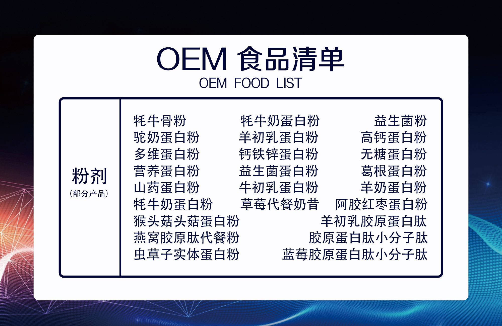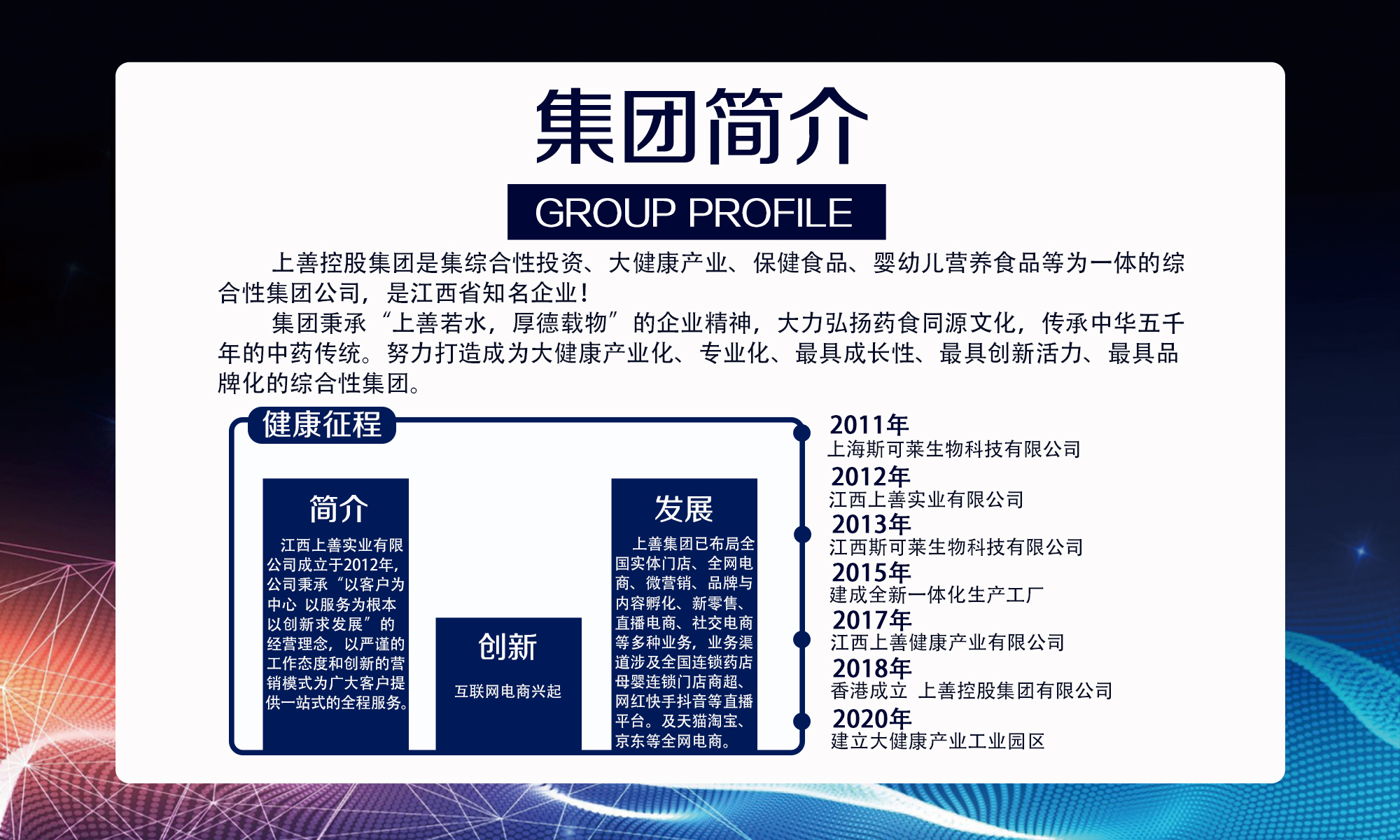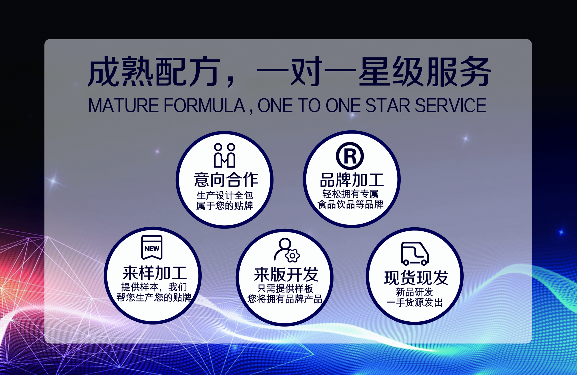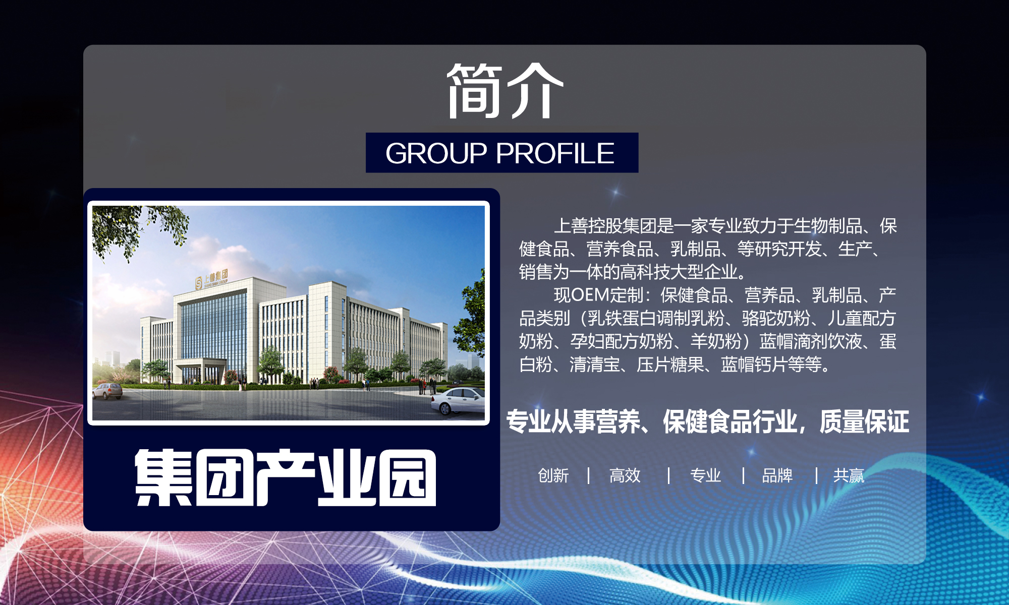 江西上善集團(tuán) 保健營養(yǎng)食品研發(fā)生產(chǎn)企業(yè)! 10萬級GMP無塵生產(chǎn)車間,與南昌大學(xué)食品工程學(xué)院聯(lián)合研發(fā)生產(chǎn)。資質(zhì)俱全 專業(yè)承接各類OEM食品/保健食品代加工項目。包含保健食品,粉劑,顆粒、壓片糖果、粉劑,口服液、代用茶。我們有專業(yè)的研發(fā)團(tuán)隊為您量身定制產(chǎn)品,專業(yè)的生產(chǎn)工廠為您塑造暢銷品種,專業(yè)的物流團(tuán)隊為您的運輸保駕護(hù)航!我們的競爭優(yōu)勢就是一站式服務(wù),讓您安枕無憂!我們的宗旨就是:把控每一步的質(zhì)量環(huán)節(jié),用我的行動換取您的信任與支持,全身心投入到市場開發(fā)的浪潮,為合作伙伴騰飛做出一點點貢獻(xiàn)! 合作:微商 會銷 電商 藥店 孕嬰店 商超及健康管理企業(yè)一條龍服務(wù)定制! 找產(chǎn)品 代工產(chǎn)品,上善集團(tuán)為您制作一切所需所想,免去您建廠、研發(fā)、生產(chǎn)、等金額的投資風(fēng)險!我們期待著與您的合作! 咨詢電話/微信:楊18979585253