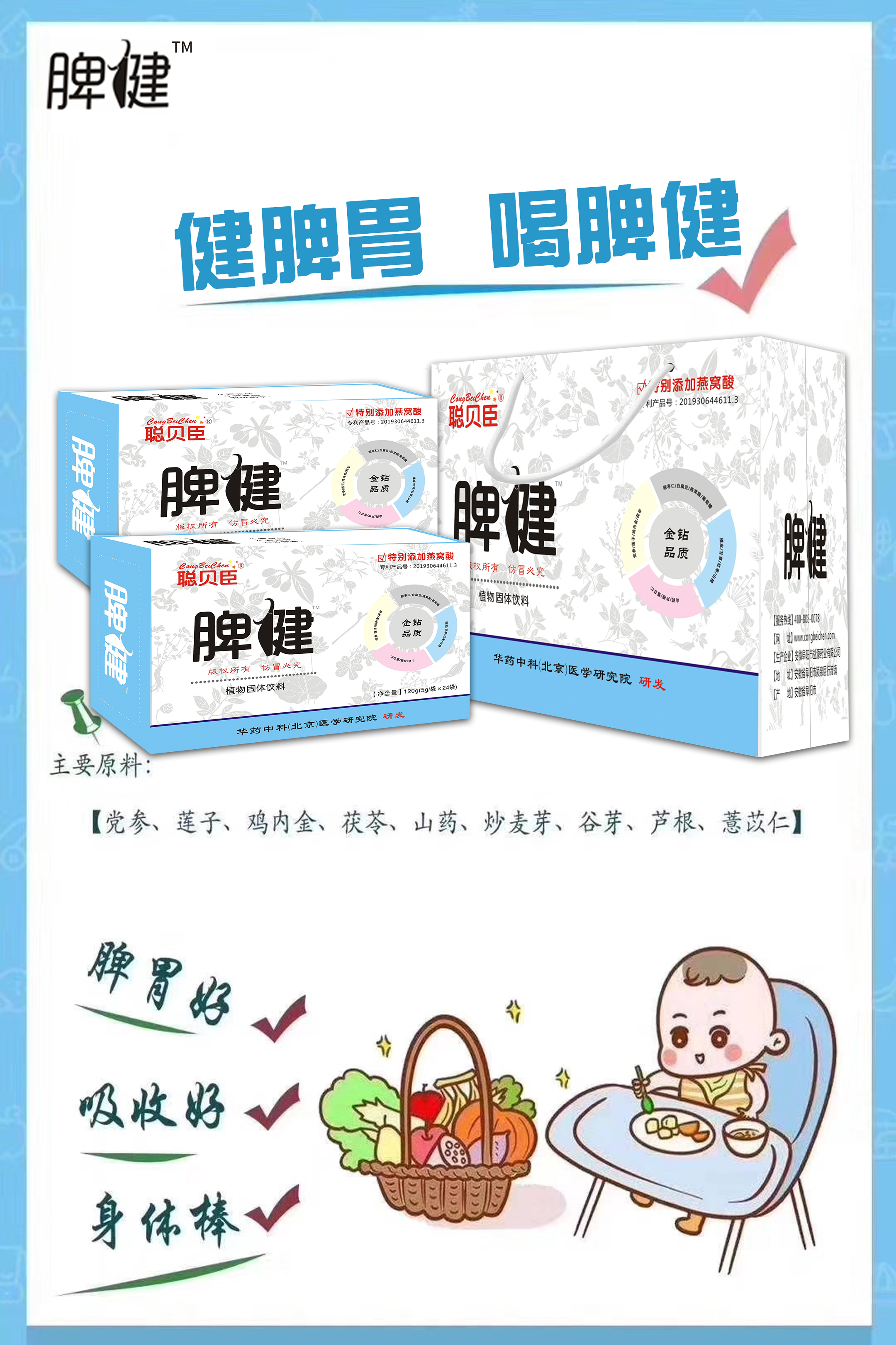 聰貝臣脾健植物顆粒,精選13種重要原料萃取而成,如雞內(nèi)金、薏苡仁、麥芽、鮮蘆根、茯苓、山藥、酸棗仁、黨參、白扁豆、谷芽、葡萄糖等我,更特別添加燕窩酸,配比科學(xué),營(yíng)養(yǎng)均衡全面,且擁有兩項(xiàng)專利及版權(quán)所有,至臻品質(zhì),值得信賴!上市以來(lái)圈粉無(wú)數(shù),快速火爆終端市場(chǎng),復(fù)購(gòu)率極高,品質(zhì)彰顯! 暢銷爆款,助陣終端!“聰貝臣脾健植物顆!被馃醽(lái)襲,攜手中國(guó)嬰童招商網(wǎng)面向全國(guó)誠(chéng)招代理經(jīng)銷商,守護(hù)成長(zhǎng),賦能終端,門店上貨不可錯(cuò)過(guò)! |