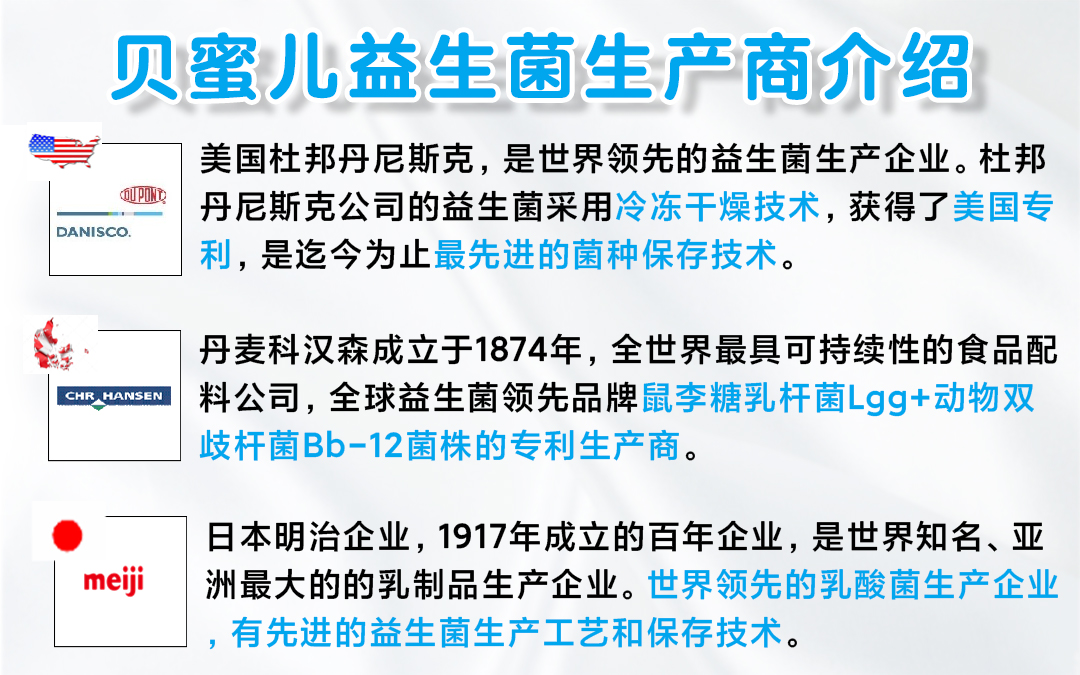 此次新品貝蜜兒益生菌,采用國家衛(wèi)計委公告可用于嬰幼兒食品的菌株,每袋含有6聯(lián)進(jìn)口益生菌,使用的菌株HN001、HN019、Bi-07、Lgg、Bb-12、M-16V,來源于美國杜邦、丹麥科漢森及日本明治,均是有大量國內(nèi)和國際臨床研究驗證的,耐胃酸耐膽汁、安全的菌株。