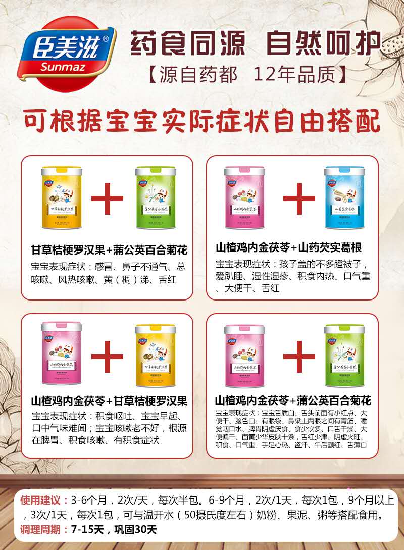 在育兒過程中,很多家長(zhǎng)會(huì)遇到這樣的狀況:孩子食欲差,不愛吃飯、不長(zhǎng)個(gè),消化吸收不暢,便秘……等等,打針吃藥不僅讓孩子更加抗拒,而且還面臨抗生素的威脅。為此,越來越多家長(zhǎng)選擇藥食同源營(yíng)養(yǎng),比如臣美滋藥食同源微晶粉,溫和調(diào)理,滋補(bǔ)養(yǎng)護(hù)嬌嫩體質(zhì),為成長(zhǎng)助力。 臣美滋藥食同源微晶粉系列共有四款單品,分別是山楂雞內(nèi)金茯苓、山藥芡實(shí)葛根、蒲公英百合菊花、甘草桔梗羅漢果。精選天然藥食同源食材為原料,采用微晶閃溶工藝以及口溶直飲技術(shù)制作而成,結(jié)晶粒度小易溶解,營(yíng)養(yǎng)成分協(xié)作吸收,傳導(dǎo)速顯著高于普通膳食補(bǔ)充。健康調(diào)理,讓孩子擁有好胃口、好體質(zhì)。